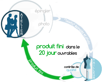 Vous recevez le vétément et profiter de la satisfaction du client à être en mesure de porter son robe faite sur commande, unique et fait avec nous pour lui.